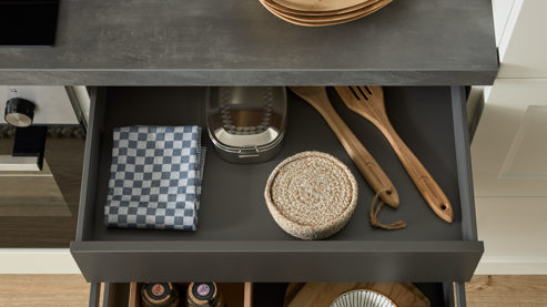 Die Culineo® Einbauküche C684 verbindet den gemütlichen Charme eines Landhausstils mit klarer, moderner Linienführung. Mattweißes Lacklaminat, kombiniert mit schiefergrauem Stripewood und schwarzen Muschelgriffen, sorgt für eine stilvolle, kontrastreiche Optik. Die Arbeitsplatten und Regalböden im Grauton Caledonia sowie mattweiße Sockelblenden verleihen der Küche ein harmonisches, helles Gesamtbild mit natürlicher Wärme.