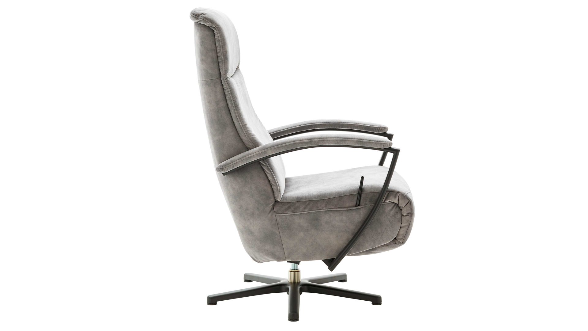 Mit dem silberfarbenen Veloursbezug Amira und dem mattschwarzen Aluminium-Sternfuß V1S strahlt der Relaxsessel 1DRF aus dem großen Modulmaster Programm MM-ZE1062 moderne Eleganz aus.