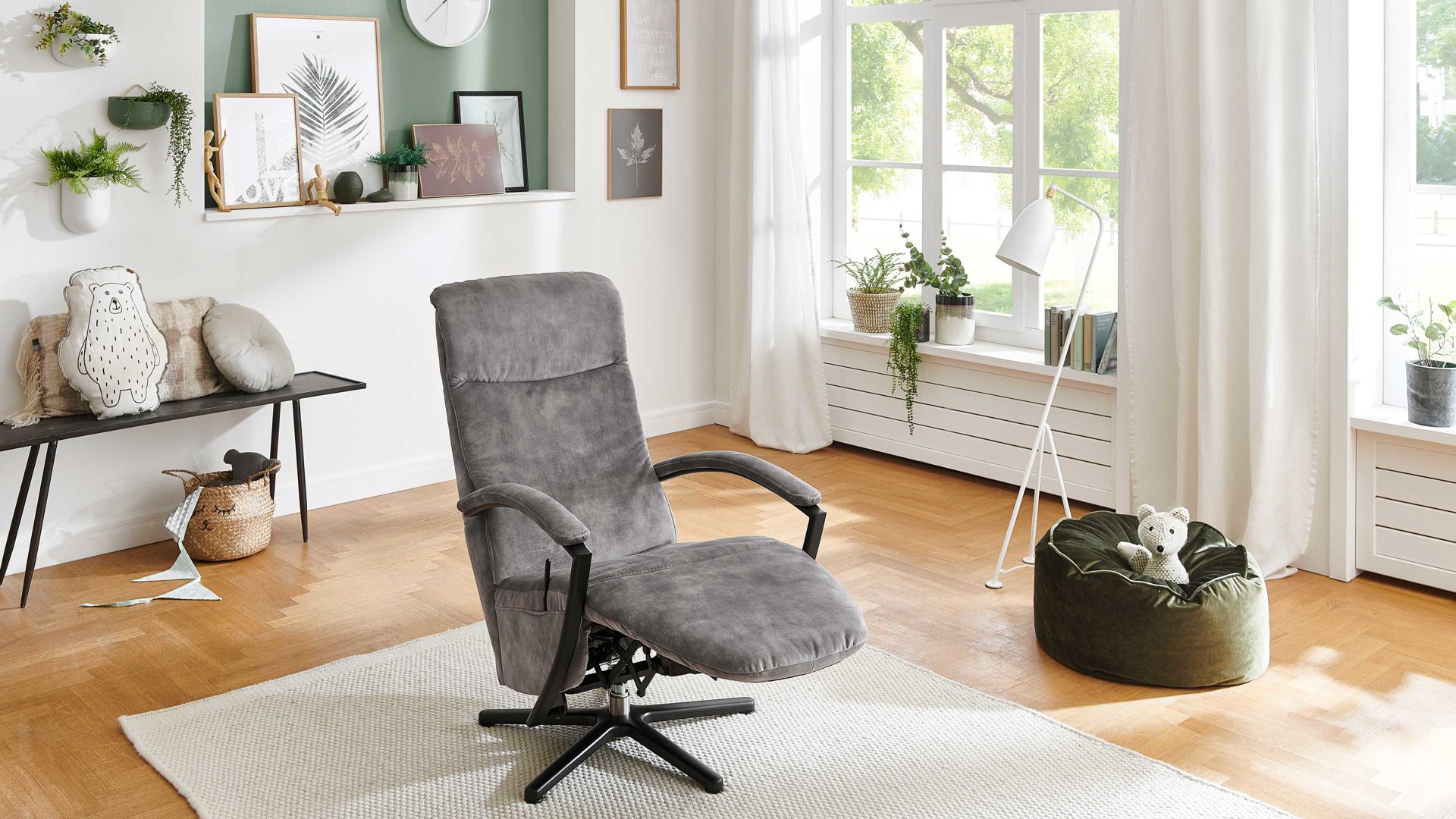 Indem Sie leichten Körperdruck ausüben, senken Sie den Rücken. In der Folge geht der Sitz automatisch nach vorn und oben. Gleichzeitig fährt die Beinauflage nach oben, bis die entspannende Relaxposition erreicht ist. Zu den funktionalen Höhepunkten gehört überdies die stufenlose Kopfpolsterverstellung. Zudem ist der Fernsehsessel um 360 Grad drehbar.
