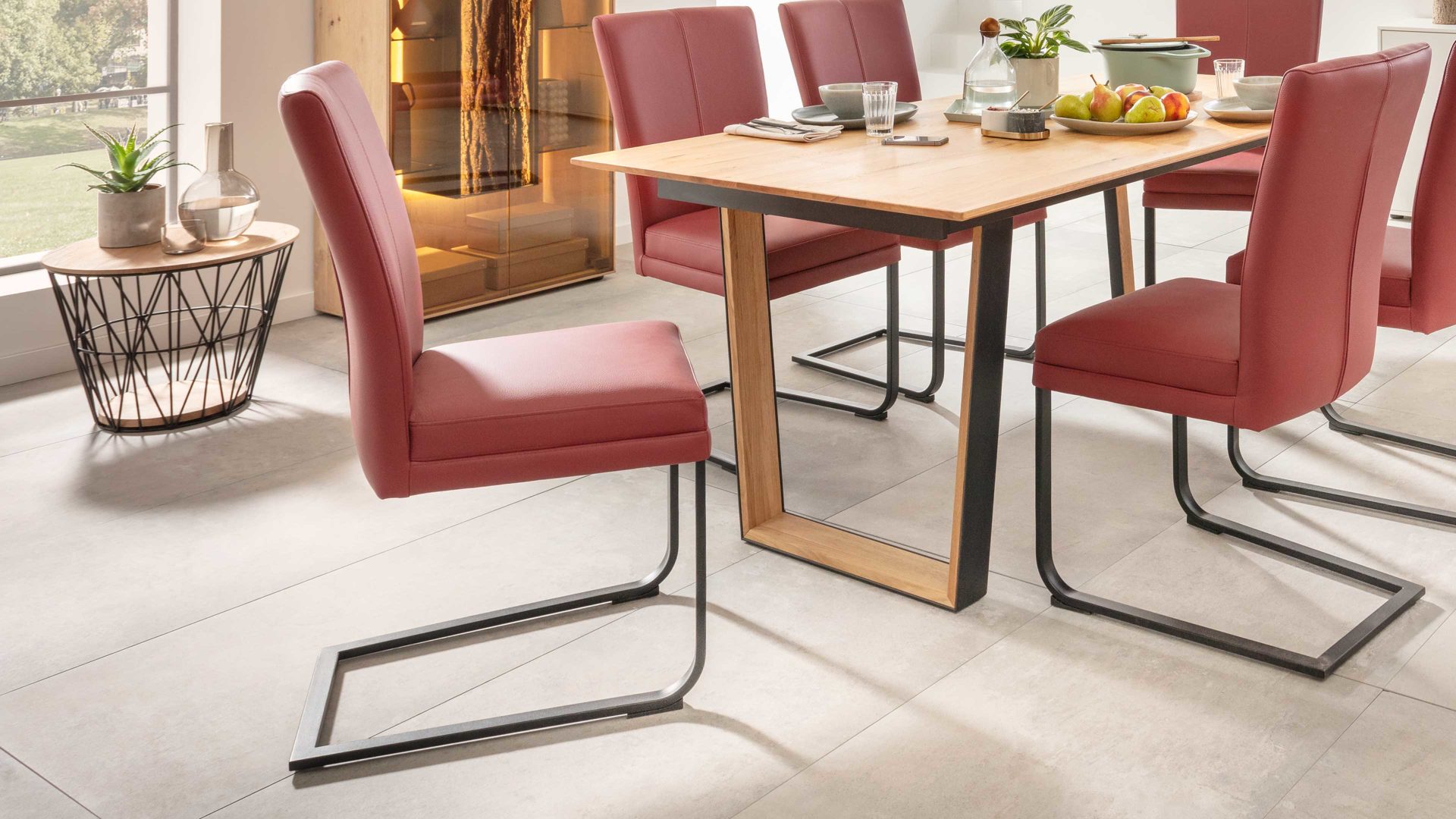 Mit einer auffälligen Farbkombination ist dieser Polsterstuhl mit Armlehnen und vier Eichenholzfüßen der Hingucker. Ob als Esszimmermöbel oder als Sitzmöbel in der Wohnküche. Sitzfläche und Rückenfläche sind mit leuchtendem Rot bezogen, wohingegen die Rückseite camelfarben ist. Die Knopfheftung im Rücken ist ein weiteres hübsches Detail.