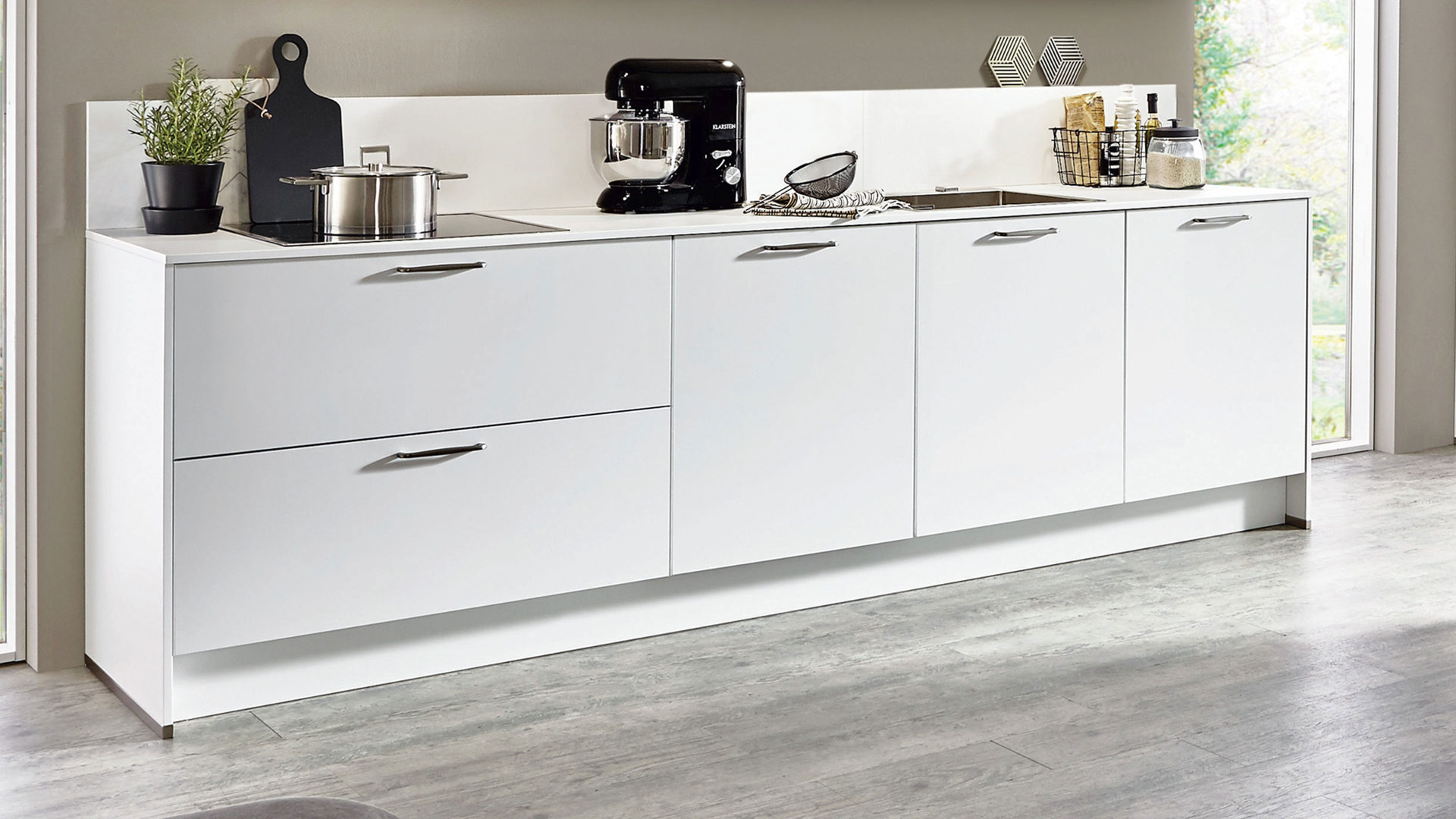 Auch die Arbeitsplatten und Sockelblenden sind alpinweiß gestaltet. Edelstahlfarbene Bügelgriffe runden die Optik stilsicher ab.