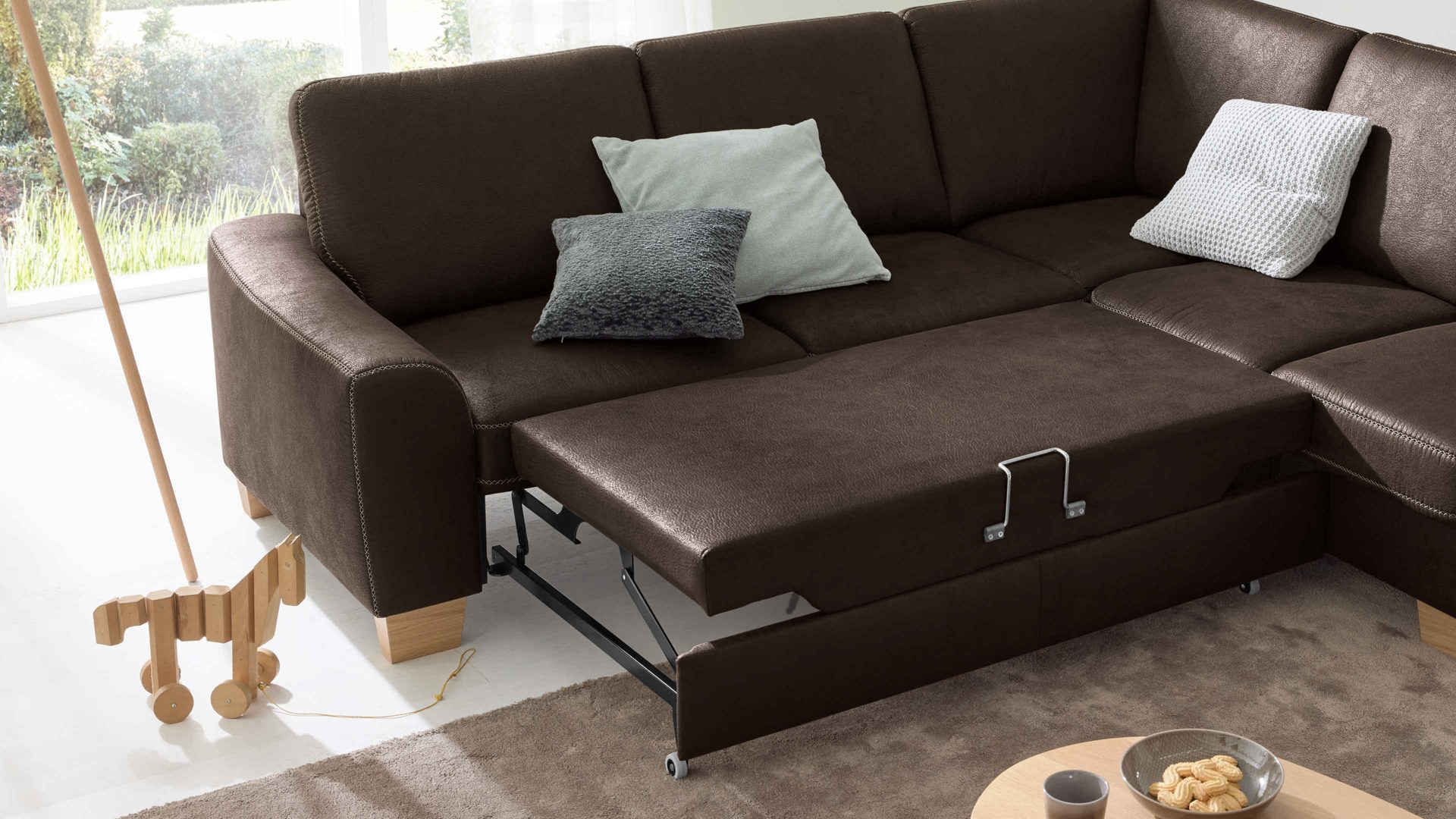 Die stoffbezogene Liegefläche ist ein Mehrpreis für die praktische Bettfunktion der Polstermöbel aus dem Modulmaster-Programm MM-ZE1037. Durch dieses Extra präsentiert sich die Liegefläche im gleichen Stoff wie die Sitzfläche des jeweiligen Sofas. Der moccafarbene Mikrofaserbezug mit Prägung präsentiert sich modern-elegant.