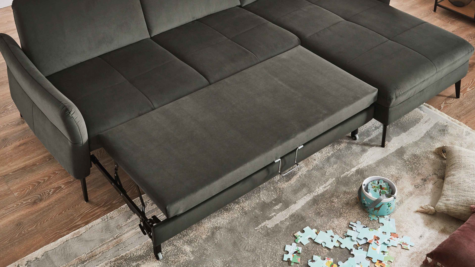 • Die Abbildung zeigt ein Wohnbeispiel, welches auch Dekoration sowie separat erhältliches Zubehör enthält. Im Lieferumfang enthalten ist eine drellbezogene Bettfunktion.