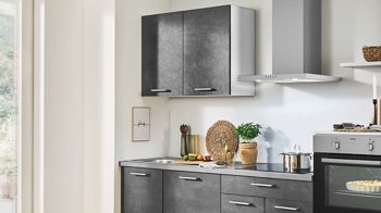 • Die Abbildung zeigt ein Wohnbeispiel, welches auch Dekoration sowie separat erhältliches Zubehör enthält. Im Lieferumfang enthalten sind eine Kücheninsel und eine Hochschranklösung.