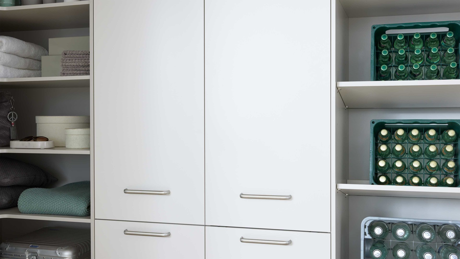 Verschiedene Schrankelemente, offene Bereiche und durchdachte Aufteilungen ermöglichen es Ihnen, Reinigungsutensilien, Vorräte, Wäsche und Alltagsgegenstände übersichtlich zu verstauen.