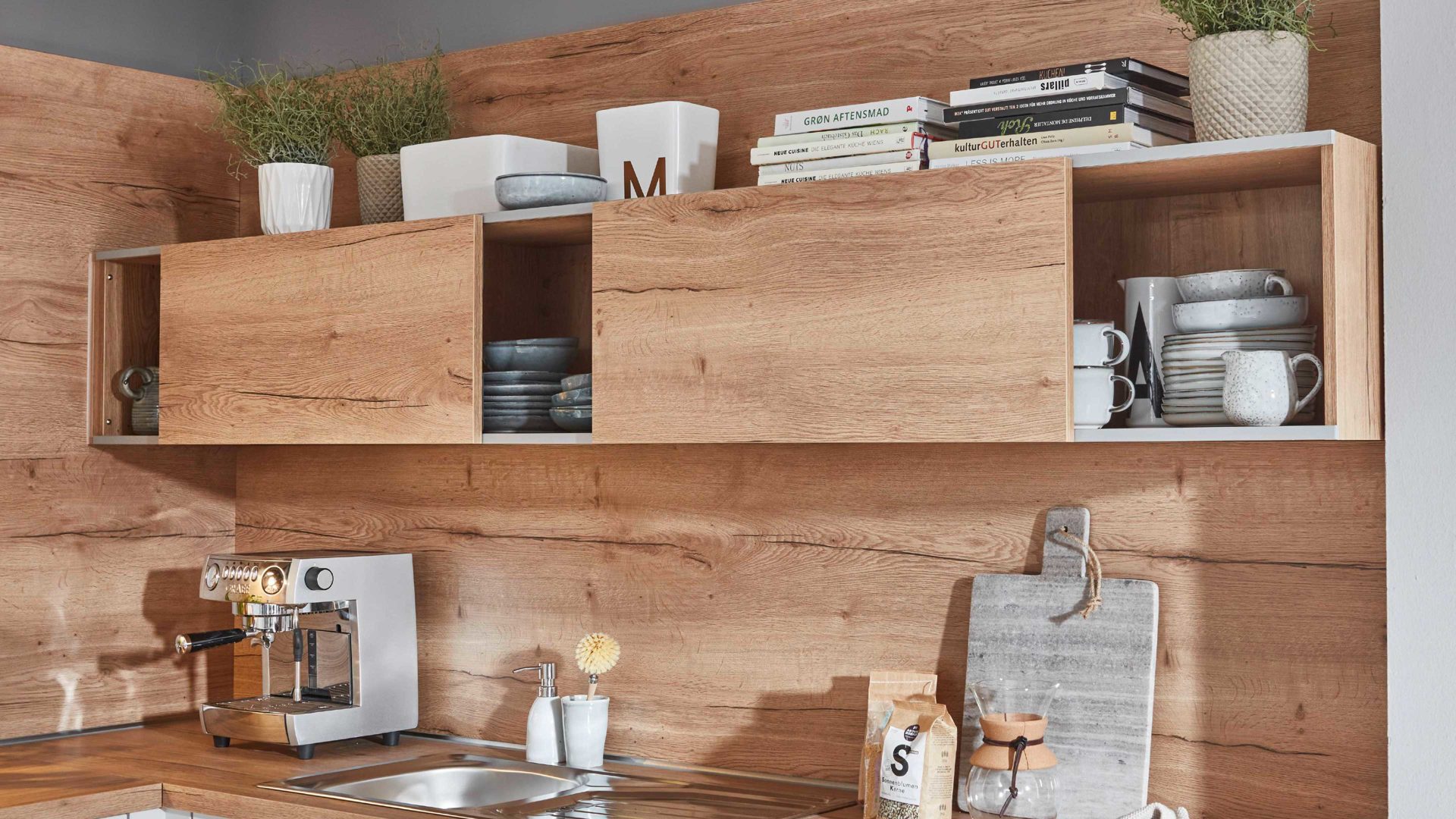 inklusive Nischen- und Rückwandverkleidung und Hängeschränken mit Schiebetüren