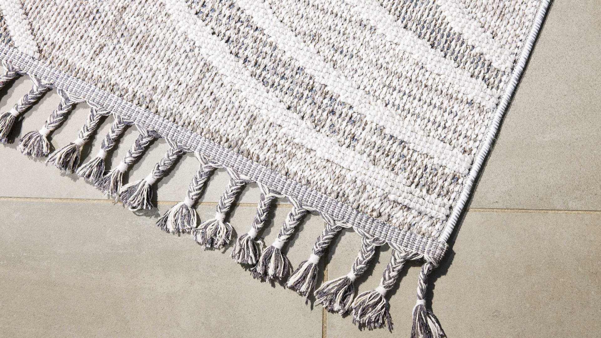 Das dezente Linienmuster in modernen Grautönen verleiht dem Wohnteppich eine stilvolle, zeitgemäße Ausstrahlung. Die feinen Fransen an den Teppichenden setzen einen charmanten Akzent und sorgen für einen Hauch von Verspieltheit – ideal für eine entspannte Outdoor-Lounge oder einen eleganten Essbereich im Freien.
