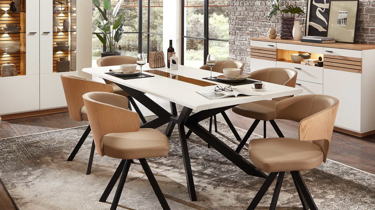 mattweiße Tischplatte, kombiniert mit Artisan Eiche-Nachbildung und mattschwarzem Metall
