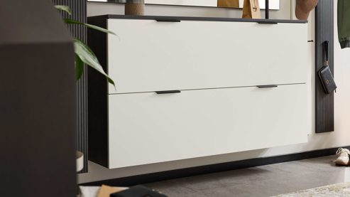 Platziere den Schuhschrank so, dass sich die Klapptüren bequem öffnen lassen und ausreichend Bewegungsfreiheit bleibt. Dank seiner Tiefe von ca. 30 cm eignet er sich ideal für schmale Flure und lässt sich perfekt mit weiteren Möbeln aus der Interliving Garderobe Serie 6015 kombinieren – für ein harmonisches Gesamtbild.