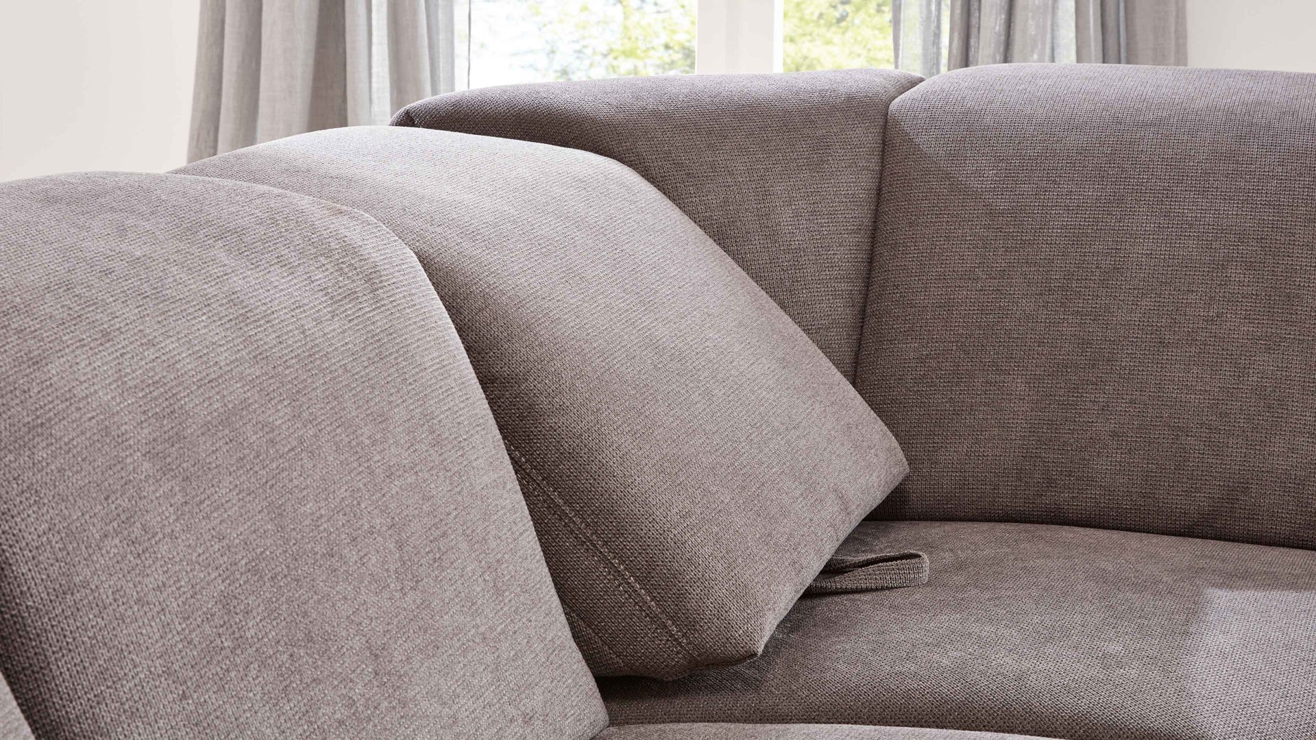 Der Relaxrücken ist ein komfortabler Funktions-Mehrpreis für Eckelemente aus dem Modulmaster-Polsterprogramm MM-ZE1106. Es handelt sich um eine manuelle Relaxfunktion für beide Seiten des Elements. Indem Sie die Rückenlehne mit der Schlaufe leicht nach oben und vorn ziehen, stellen Sie den Neigungswinkel schräg zur Relaxposition.