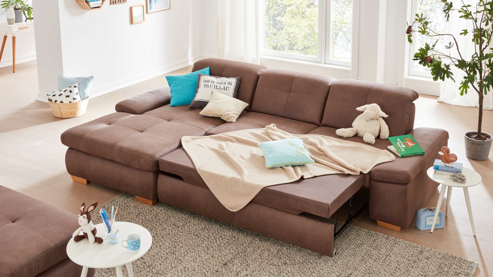 Mit der Querschläfer-Funktion verwandeln Sie die Couch schnell und einfach in ein gemütliches Gästebett oder in eine besonders große Wohnlandschaft, auf der Sie sich noch besser entfalten und entspannen können. Die Liegefläche ist mit Polyätherschaum auf Federholzleisten gepolstert sowie mit Nesselstoff bezogen, gegen Mehrpreis allerdings auch mit dem Originalstoff erhältlich.