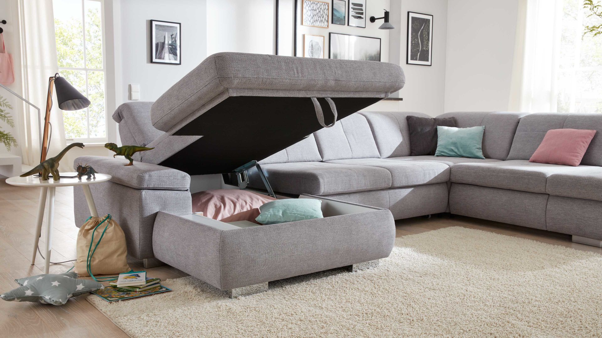 Die Aufklappfunktion F ist ein praktisches Mehrpreis-Extra für die Canapés aus dem Modulmaster-Programm MM-MP1044. Sie schafft innen klassisch weiß beschichteten Stauraum für Textilien wie Decken und Kissen, aber auch viele andere Gegenstände. Die Handhabung ist einfach und sicher.