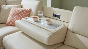 • Die Abbildung zeigt ein Wohnbeispiel, welches auch Dekoration sowie separat erhältliches Zubehör enthält. Im Lieferumfang enthalten ist ein Einsitzer-Kombielement mit Anstellhocker links, ein 2,5-Sitzer-Zwischenelement ohne Armlehnen und ein Canapé mit Armlehne rechts.