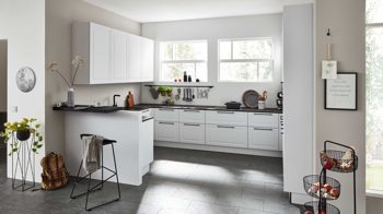 Auch funktional überzeugt die Küche auf ganzer Linie. Die U-Form bietet reichlich Platz für Küchenutensilien, Geschirr und Vorräte. Mit einer Stellfläche von ca. 285 x 400 cm (BxL) und Schenkelmaßen von ca. 285 x 400 x 247,5 cm (BxLxB, von links nach rechts) ist sie großzügig dimensioniert. Eine edel-mattschwarze Interliving Einbauspüle mit passender schwarzer Einhebel-Mischbatterie ist ebenfalls Teil der Ausstattung und fügt sich harmonisch ins Gesamtbild ein.