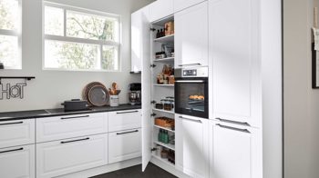 Die Interliving Küche Serie 3045 verbindet klassische Schlichtheit mit modernen Details. Ihre softmatten weißen Fronten wirken zeitlos elegant und harmonieren perfekt mit den premiumweißen Korpussen und Sockelblenden. Für spannende Kontraste sorgen die Arbeitsplatten im Farbton Terra Mare sowie die schwarzen Griffe und der schwarze Tresen, die dem Design eine stilvolle Landhausnote verleihen.