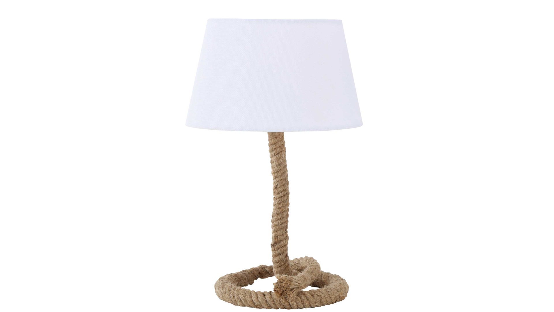 Tischleuchte Toko | weißer Polyester-Lampenschirm | mit Jute umwickelter Eisenfuß | Höhe ca. 40 cm, Durchmesser ca. 24 cm | ohne Leuchtmittel, benötigt wird 1x 27, maximal 40 Watt | EU-Stecker | Kabellänge ca. 150 cm | auch mit naturfarbenem Lamepnschirm erhältlich