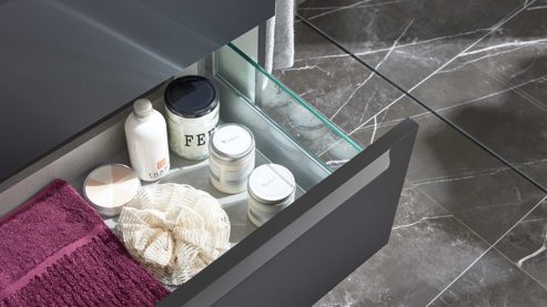 Darunter sorgt der ca. 100 x 58 x 46 cm (B/LxHxT) große Waschtischunterschrank (Typ 2838) für großzügigen Stauraum. Ausgestattet mit zwei geräumigen Auszügen, Soft-Close und Selbsteinzug, bietet er dir höchsten Komfort im Alltag. Eine Rückwand ist integriert, Glas-Seitenwände sind optional gegen Mehrpreis erhältlich.