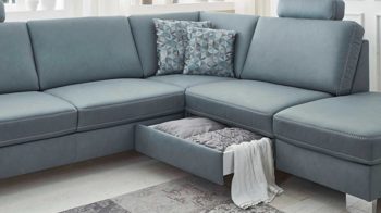 • Die Abbildung zeigt ein Wohnbeispiel, welches auch Dekoration sowie separat erhältliches Zubehör enthält. Im Lieferumfang enthalten ist ein Ecksofa ohne Extras.