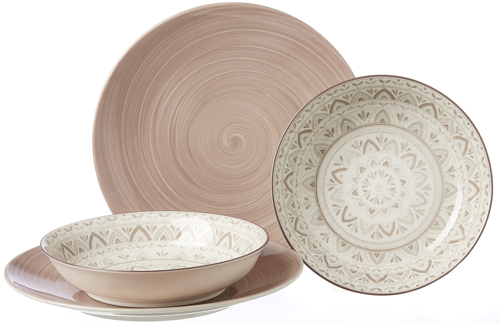 Bei diesem Tafelservice gehen hohe Qualität und kreativ-stilvolles Design Hand in Hand. Das Geschirr präsentiert sich in einem warmen, wohnlich-einladenden Braunton, akzentuiert durch Ornamente, die einerseits Verspieltheit und andererseits Harmonie ausstrahlen. Hergestellt ist das Essgeschirr aus erstklassigem Porzellan. Dank des edlen Materials und des charmanten Designs erscheint das Tafelgeschirr sehr elegant.