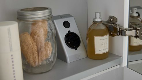 Praktisch und modern: Im linken Bereich ist ein Steckdosen-Schalterelement integriert – perfekt, um Föhn, Rasierer oder elektrische Zahnbürsten bequem zu nutzen. Ein 30-Watt-LED-Converter sorgt für die passende Energieversorgung und kann mit einer optionalen Leuchte ergänzt werden, die für optimale Beleuchtung am Waschplatz sorgt.