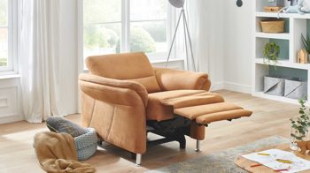 Sie ist mit trendig zimtfarbenem Stoff bezogen, der edle Gemütlichkeit ausstrahlt und mit unterschiedlichen Einrichtungen bestens harmoniert. Einen gelungenen Akzent setzt die beige Kontrastnaht. Runde aluminiumfarbene Metallfüße vervollständigen das stilvolle Design und verleihen dem Sofa zudem die nötige Standfestigkeit.