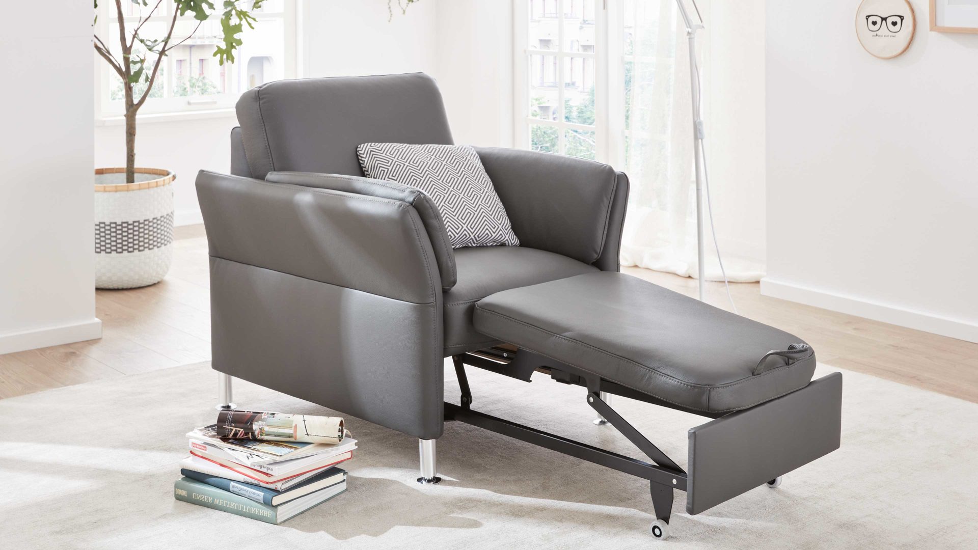Dank der hochwertigen, soften Kaltschaumpolsterung auf Wellenunterfederung und der angenehmen Haptik des Leders genießen Sie auf dem edlen Polsterssel hohen Sitzkomfort. Seine Maße belaufen sich auf ca. 86 x 90 x 93 cm (BxHxT), bei einer Sitzhöhe von ca. 43 cm und einer bequemen Sitztiefe von ca. 56 cm. Das unschlagbare Plus dieses Ledersessels ist der Auszughocker mit Maßen von ca. 50 x 65 cm (BxL), der für noch mehr Bequemlichkeit sorgt.
