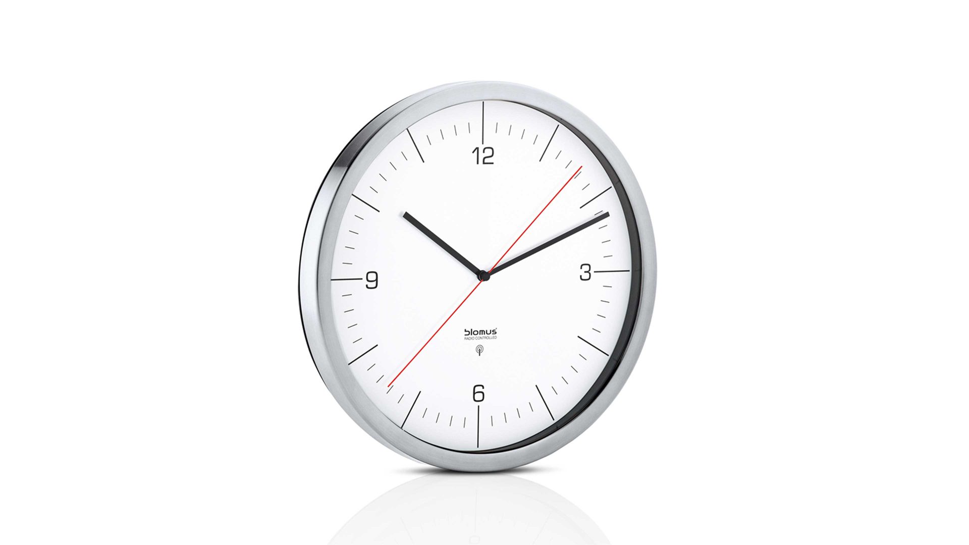 blomus Funk-Wanduhr Crono | weißes Kunststoff-Ziffernblatt mit schwarzer Beschriftung | matte Edelstahleinfassung | eingestellt nach mitteleuropäischer Zeit | roter Sekundenzeiger | geeignet für Länder, die im Umkreis von 2000 km von Offenbach liegen | Durchmesser ca. 24 cm | Rahmenhöhe ca. 5 cm | inklusive Batterie | in verschiedenen Ausführungen bestellbar