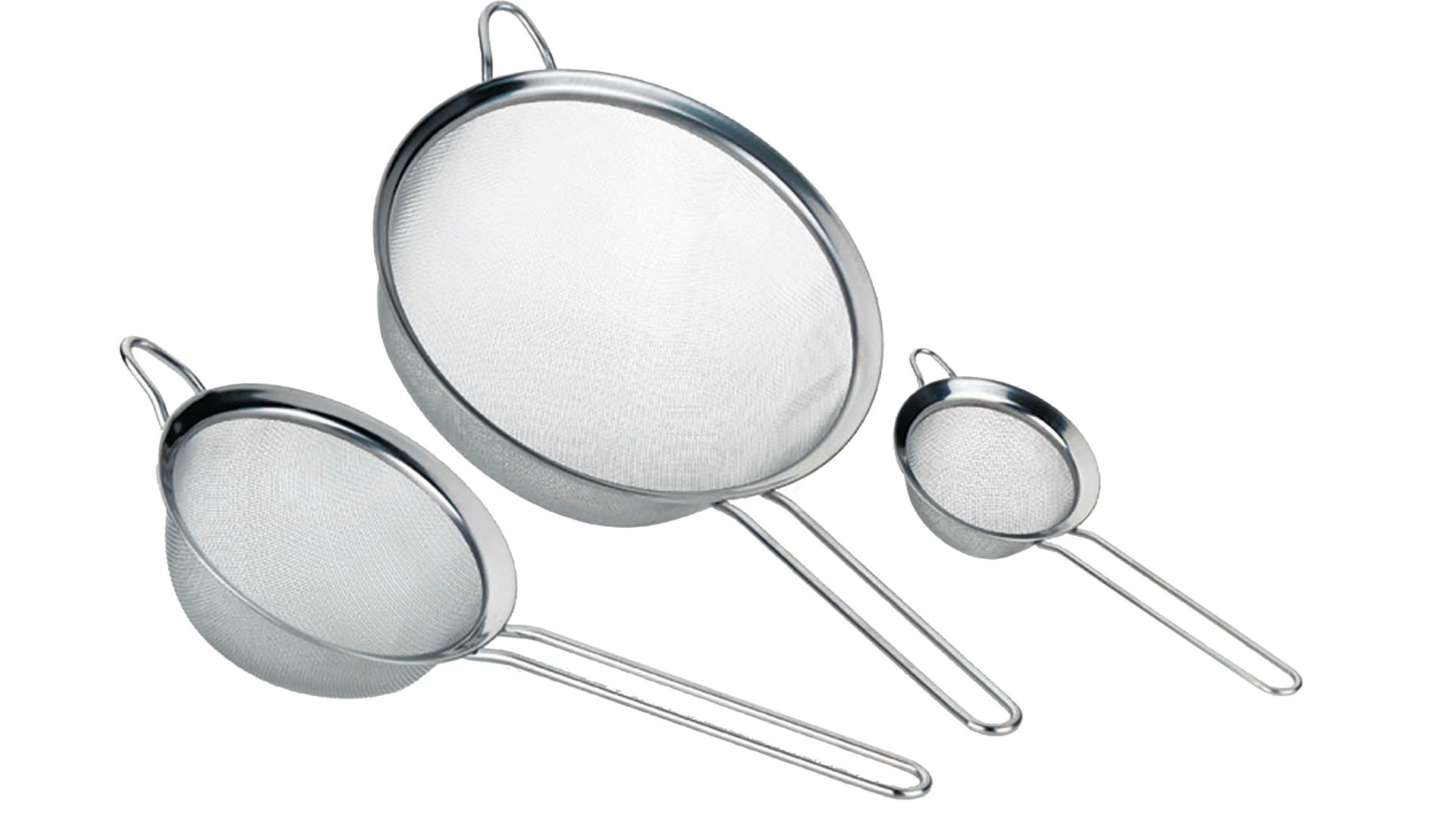 Jedes Sieb besteht aus edelstahlfarbenem Metall und eignet sich dadurch hervorragend für den Gebrauch in der Küche. Das kleinste Küchensieb hat einen Durchmesser von ca. 8 cm, das mittlere von ca. 14 cm und das größte Sieb von ca. 20 cm. Mit dem Haken sowie dem langen Griff hängen Sie die Siebe zum Abseihen oder Passieren ganz unkompliziert in Topf und Schüssel. Das Küchensiebset ist spülmaschinenfest.