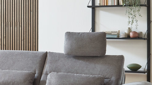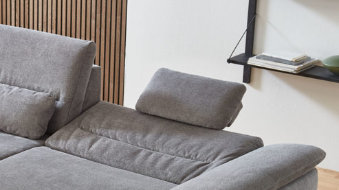 die Kopfstütze wird in die Kopfstützenvorrichtung an der Rückenlehne des Sofas eingesteckt und lässt sich dann in der Höhe und in der Neigung manuell verstellen