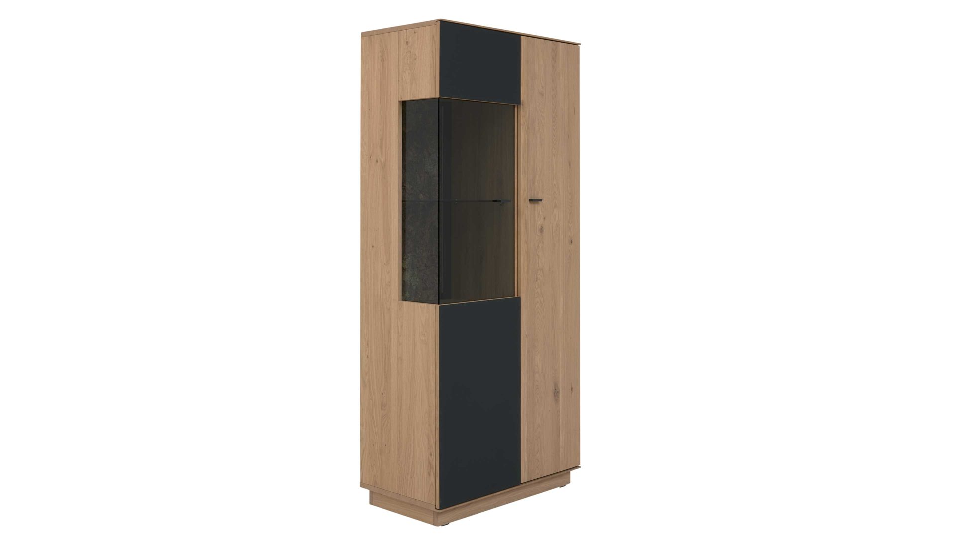 Die links angeschlagene Glastür mit Glasauflage und Glaseinsatz eröffnet zusätzliche Möglichkeiten zur Präsentation. Hinter ihr befinden sich drei Holzböden und ein Klarglasboden, auf denen du Deko, Gläser oder Sammlerstücke gekonnt in Szene setzen kannst. So vereint die Vitrine geschlossenen Stauraum mit offenen Präsentationsflächen – für ein ausgewogenes und elegantes Gesamtbild.