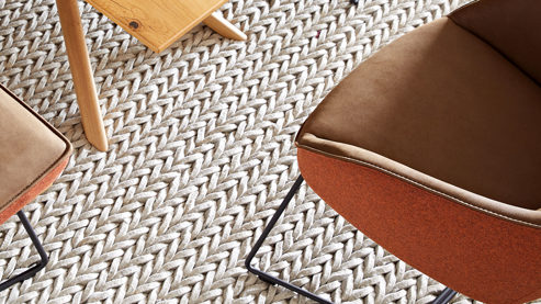 Unter- und Rückseite sind mit Wollfilz aus 70 % recycelten Wollgarnen bezogene Sitzfläche, bequem mit Polyschaum auf Wellenunterfederung gepolstert