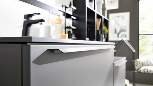 Alle Schubladen und Türen verfügen über Softclose-Technik mit Selbsteinzug, sodass alles leise und schonend schließt. Gleichzeitig handelt es sich um ein individuell planbares Badmöbelprogramm, mit dem du dein Bad passgenau und stilvoll gestalten kannst.