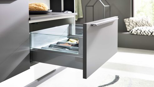 Mit ca. 60 x 29 x 46 cm (B/LxHxT) bietet der Auszugschrank (Typ 2325) zusätzlichen Stauraum. Der schiefergraue Abdeckboden (Typ 16849) runden das elegante Erscheinungsbild ab. Die Glas-Seitenverkleidungen erhältst auf Wunsch gegen Mehrpreis.