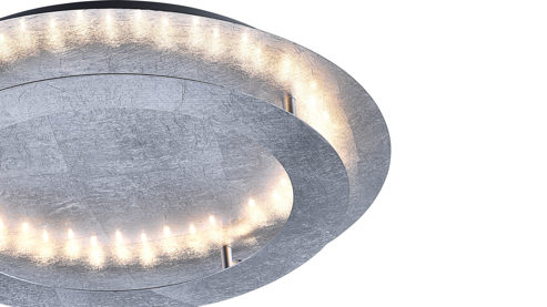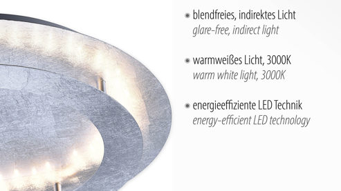 Mit einer Höhe von ca. 8 cm passt die moderne Lampe an der Decke auch hervorragend in Ihr Schlafzimmer. Zudem präsentiert sich die LED-Deckenleuchte mit einer besonderen Oberfläche: Eine Hammerschlaglackierung verleiht dem silberfarbenen Metall eine einzigartige Struktur. Bei diesem Leuchtenmodell sind die vier LED-Boards mit je 6 Watt, 480 Lumen und 3.000 Kelvin inklusive. Das enthaltene sowie langlebige Leuchtmittel entspricht der Energieeffizienzklasse G (Spektrum A bis G).