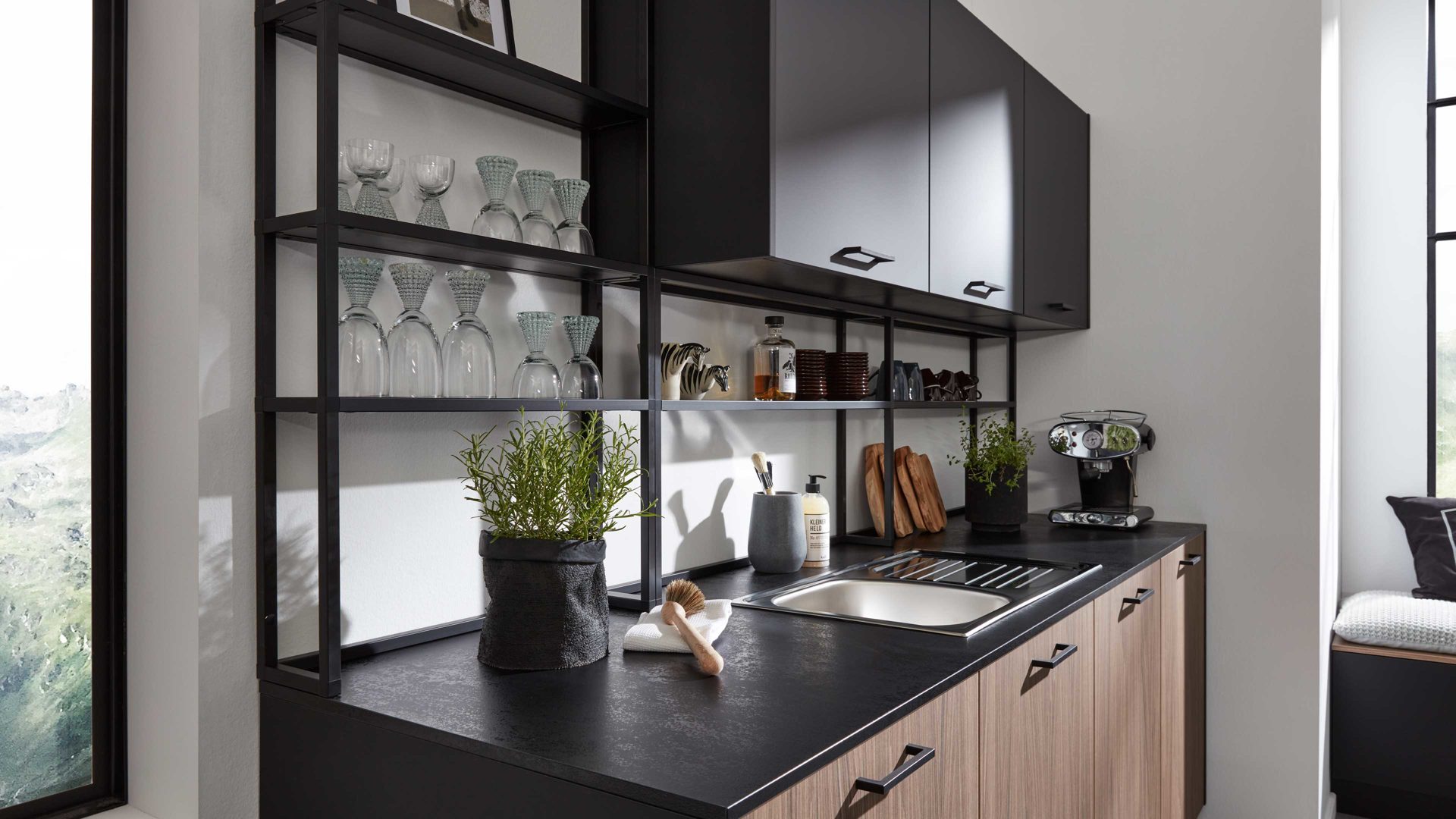 Die WERT KÜCHE® Ava kombiniert matte onyxschwarze Fronten mit Akoni Wood-Nachbildung. Im letztgenannten Farbton ist auch der einladende Tresen gestaltet. Lavaschwarze Arbeitsplatten, Sichtseiten und Sockelleisten sowie mattschwarze Metallregale und klassisch schwarze Kunststoff-Bügelgriffe runden das moderne Design harmonisch ab.