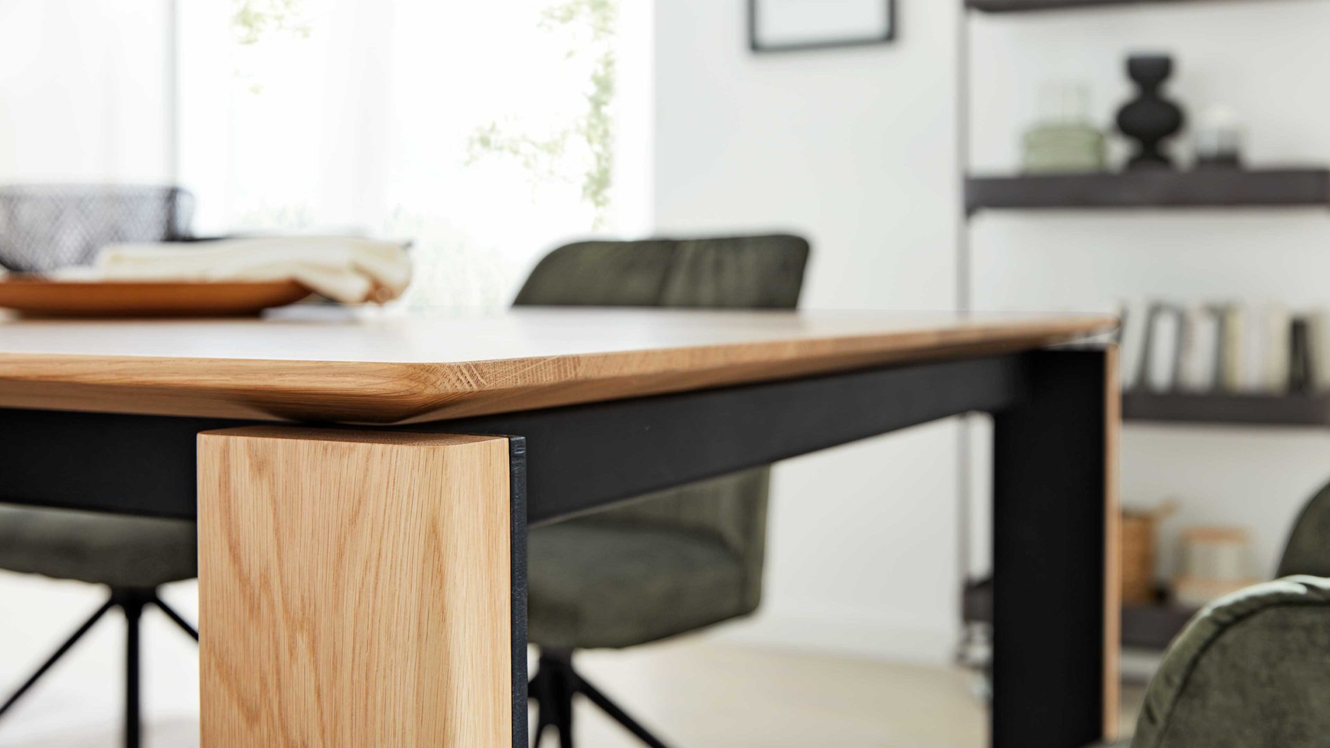 Der Esstisch aus der Interliving Esszimmer Serie 5110 bringt dir natürlichen Charme und modernes Design in einem Möbelstück an den Esstisch. Die natur geölte Tischplatte aus Eichenholz mit markanter Schweizer Kante und 24 mm starker Ausführung zeigt die Maserung des Holzes besonders schön und sorgt für eine warme, wohnliche Atmosphäre. Die Füße aus mattschwarz lackiertem Metall sind zusätzlich mit Eichenholz ummantelt – so entsteht ein harmonischer Mix aus Holz und Metall, der gleichzeitig modern und zeitlos wirkt. Mit Maßen von ca. 220 x 76 x 100 cm (B/LxHxT) ist der Massivholztisch ideal, wenn du dir einen großzügigen Mittelpunkt für deinen Essbereich wünschst.