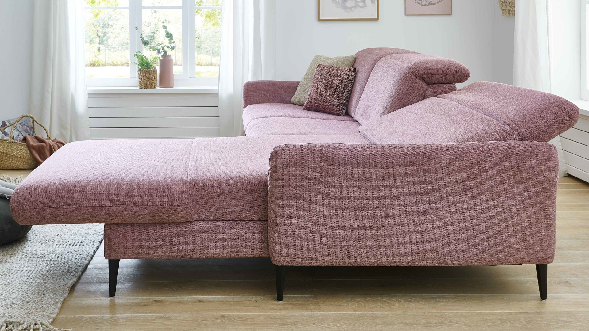 Zu den Highlights des Polsterprogramms gehören die grundsätzlich im Originalstoff bezogenen Rückseiten, die bei allen Elementen enthaltene Kopfpolsterverstellung sowie die für Staubsaugerroboter ideale Bodenfreiheit. Die Serie ist Made in Europe und mit dem Goldenen M ausgezeichnet.