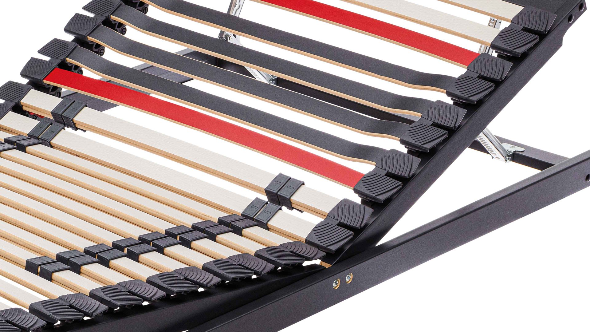 Die elastischen Federleisten sind in langlebigen Hightech-Kappen gelagert, die dauerhaft flexibel bleiben und geräuscharm arbeiten. Verstärkte Querleisten mit Winkelsicherung sowie hochfeste Gelenkschrauben aus Stahl erhöhen die Stabilität zusätzlich und sorgen für eine dauerhaft sichere Konstruktion.