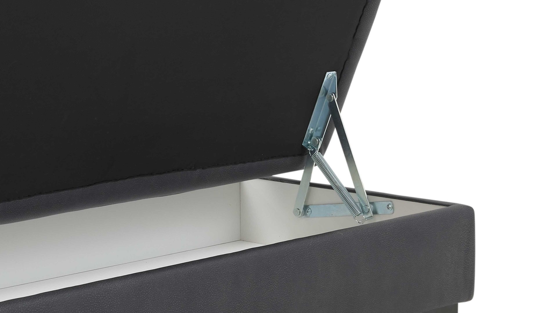 Ein echtes Highlight ist die integrierte Aufklappfunktion: Unter der Sitzfläche verbirgt sich ein großzügiges, weiß beschichtetes Innenfach, das praktischen Stauraum bietet – ideal für Decken, Kissen oder Zeitschriften. Dank der hellen Innenoptik wirkt der Stauraum gepflegt und übersichtlich. So wird der XXL-Hocker zum funktionalen Multitalent, das Design und Nutzen perfekt miteinander verbindet.