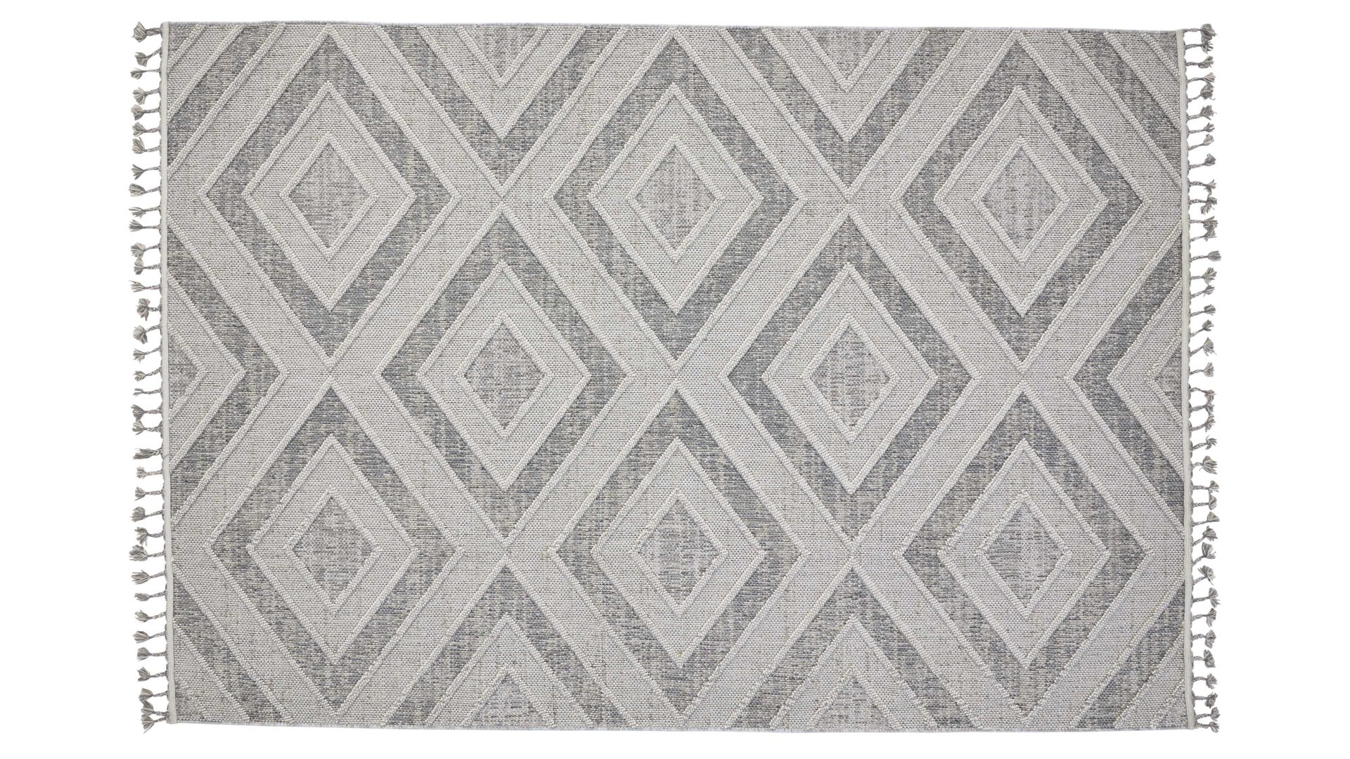 Das geometrische Rautenmuster in eleganten Grautönen verleiht dem Außen-Teppich eine moderne, zeitlose Ausstrahlung. Die zarten Fransen an den Enden setzen verspielte Akzente und sorgen für eine stilvolle Leichtigkeit – perfekt abgestimmt auf deine Outdoor-Lounge oder deinen Essbereich im Freien.