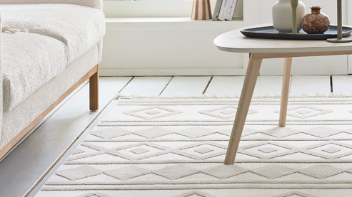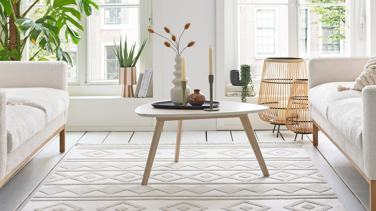 die furnierte Tischplatte wird von vier Massivholzfüßen getragen