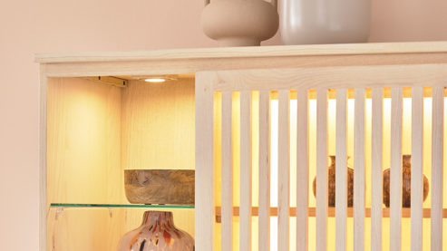rechts ein offenes Fach mit einem höhenverstellbarem Glasboden und LED-Spotbeleuchtung