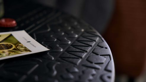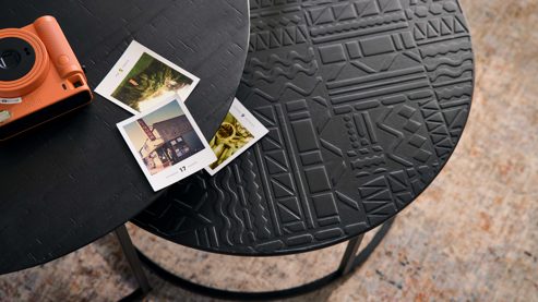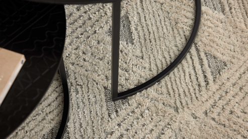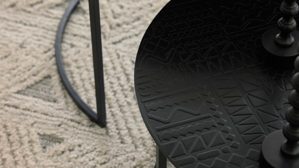 der kleine Tisch hat eine aufwändig verzierte Platte, der große Tisch hat eine glatte Oberfläche - beide mit rundum abgeschrägte Kanten, die haben Gestelle bodenschonende Kunststoffgleiter