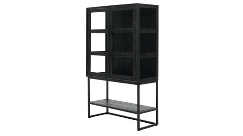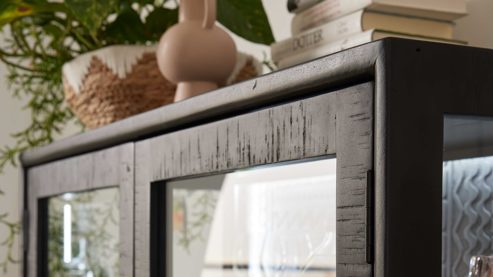 gebürstetes schwarz gebeiztes und lackiertes Mangoholz, kombiniert mit Klarglas und schwarzem Metall