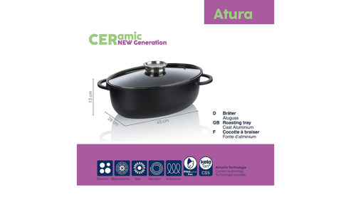 Entdecken Sie den großen, ovalen Atura Bräter aus Aluguss mit einem Fassungsvermögen von 8 Litern – ideal für die Zubereitung von saftigen Braten und herzhaften Schmorgerichten. Der innovative Glasdeckel mit Aromagriff ermöglicht es Ihnen, während des Kochens Flüssigkeit hinzuzufügen, ohne den Deckel anzuheben. Dank der robusten Aluguss-Konstruktion und dem induktionsfähigen Allherd-Boden gelingt jedes Gericht perfekt. Die pflegeleichte Keramikbeschichtung macht die Reinigung besonders einfach. Dieser Bräter ist ein vielseitiges und praktisches Küchenwerkzeug, das Ihnen das Kochen erleichtert. Maße ca. 28 x 13 x 45 cm (BxHxL)