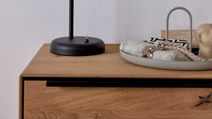 Die Klapptür des Lowboards mit Akzent-Holzfront in gehobelter und gebürsteter Asteiche sorgt für natürlichen Charme und bietet großzügigen Stauraum. Das integrierte Paneel mit offener Ablage setzt deine Deko oder Medientechnik stilvoll in Szene. Maße ca. 182 x 62 x 40 cm (B/LxHxT).