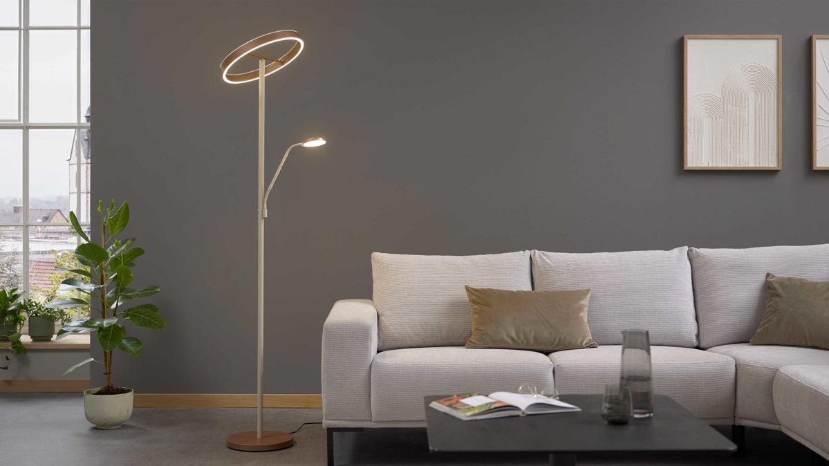 Der integrierte LED-Fluter sorgt mit 39 Watt, der Energieeffizeinzklasse F (Spektrum A bis G), 4600 Lumen und dimmbarer Lichtfarbe von 2700 bis 4000 Kelvin für eine starke, gleichmäßige Raumbeleuchtung. Dank Touchdimmer kannst du die Helligkeit flexibel regulieren und die Farbtemperatur deiner Stimmung anpassen. Zusätzlich bietet das praktische Leselicht mit 6 Watt, 550 Lumen und einem flexiblen Arm punktgenaue Beleuchtung – perfekt zum Lesen oder Arbeiten. Auch hier steuerst du Lichtintensität und -farbe komfortabel über den Touchdimmer.