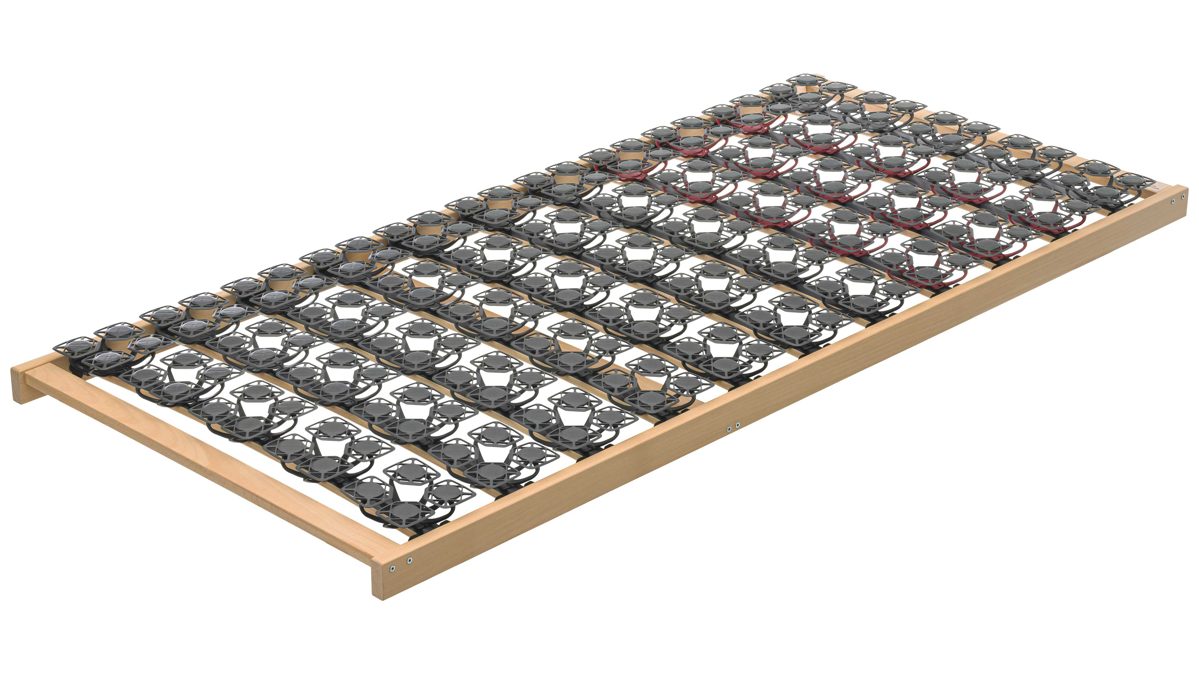 Für die individuelle Unterstützung deines Körpers sorgen 11 Tellerleistenpaare mit jeweils 6 flexiblen Teller-Modulen. Insgesamt kommen bei einer Größe von ca. 100 x 200 cm 66 elastische Teller-Elemente aus langlebigem Hightech-Material zum Einsatz, die eine punktgenaue Druckverteilung ermöglichen. Der Tellerrahmen ist bis maximal 110 kg belastbar und passt sich deinen Bewegungen dynamisch an.