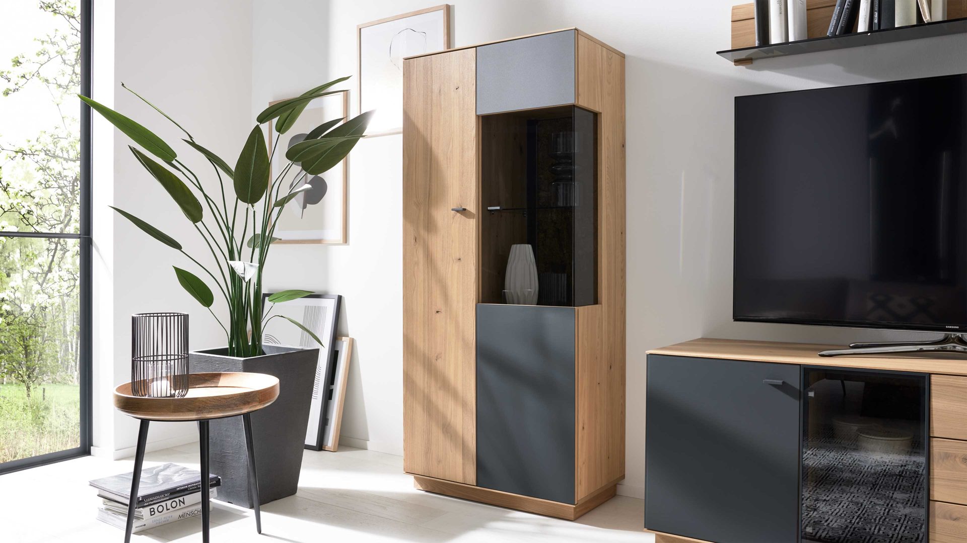 • Die Abbildung zeigt ein Wohnbeispiel, welches auch Dekoration sowie separat erhältliches Zubehör enthält. Im Lieferumfang enthalten ist ein Hängeelement mit Glastür und Spaltholz-Rückwand.